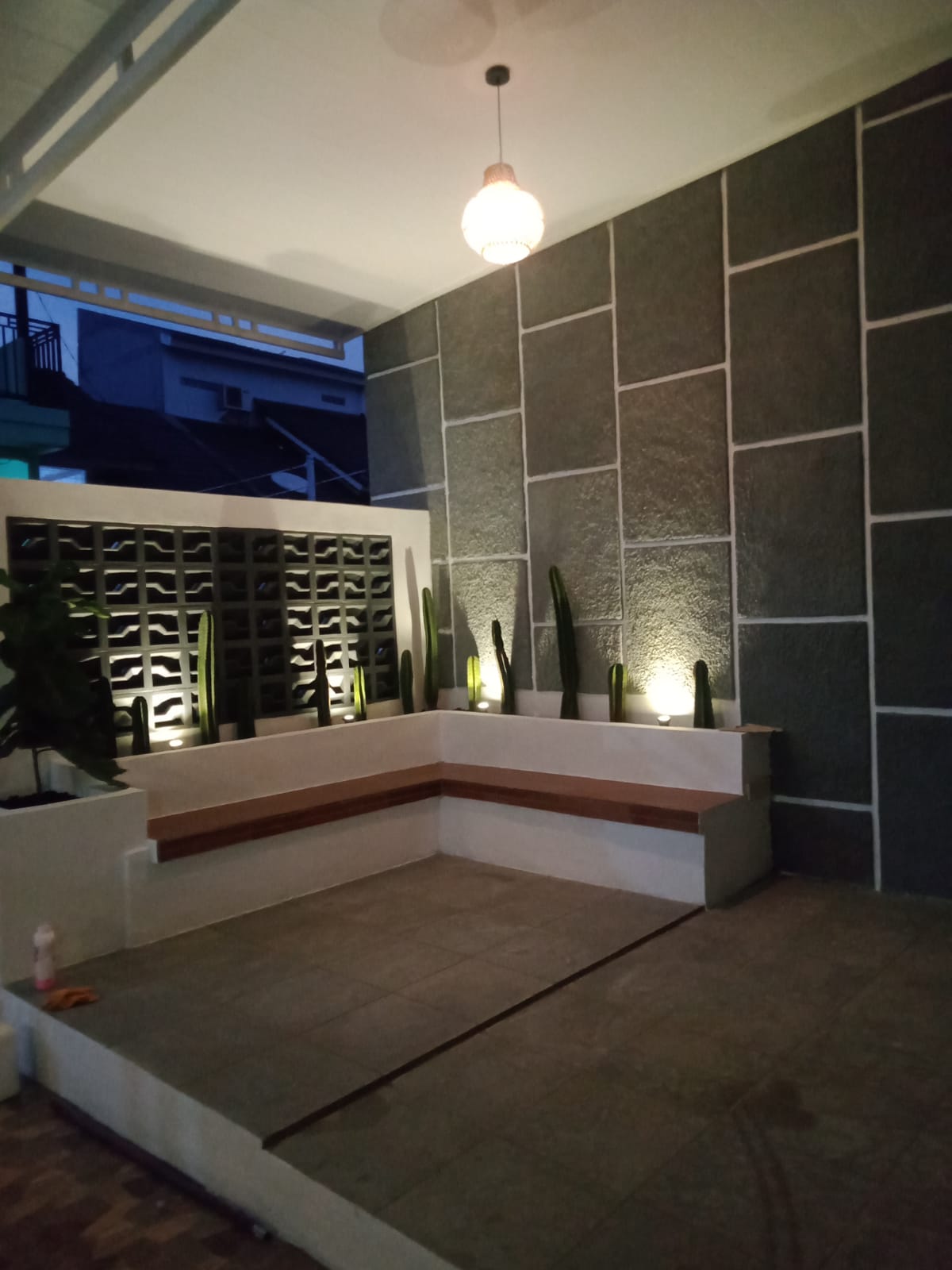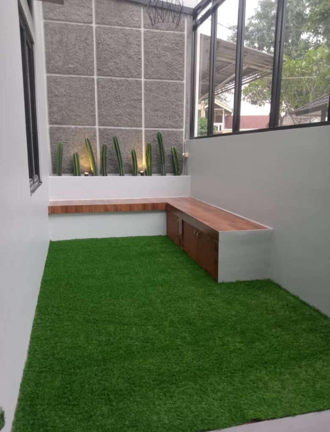 Dengan tambahan rumput sintetis, taman menjadi terlihat lebih hijau, bersih, dan mudah dibentuk sesuai konsep modern minimalis.